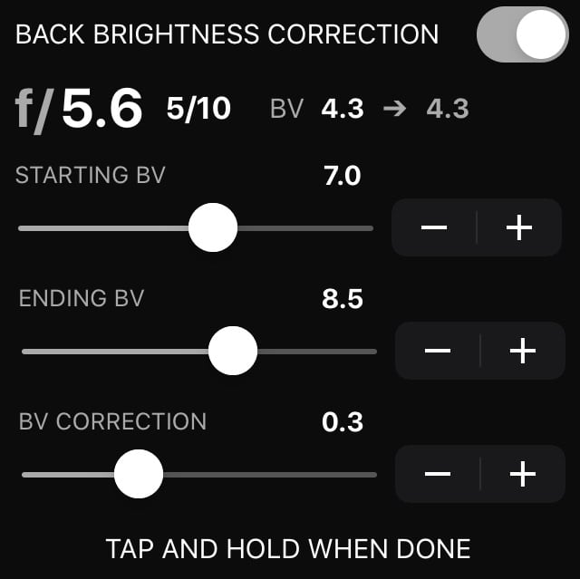 The current f/stop is shown in the style you selected (here, fractional tenth stops). The white BV number after the aperture is the brightness value you’ll use to set the controls. (The gray number after the arrow is the corrected BV: the original BV minus the correction.) - Turn the switch on, and set BV CORRECTION to 0.0.