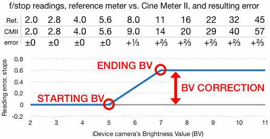 - The bv correction is the difference in stops between the two meters’ readings at the higher levels.